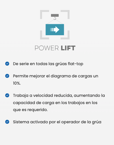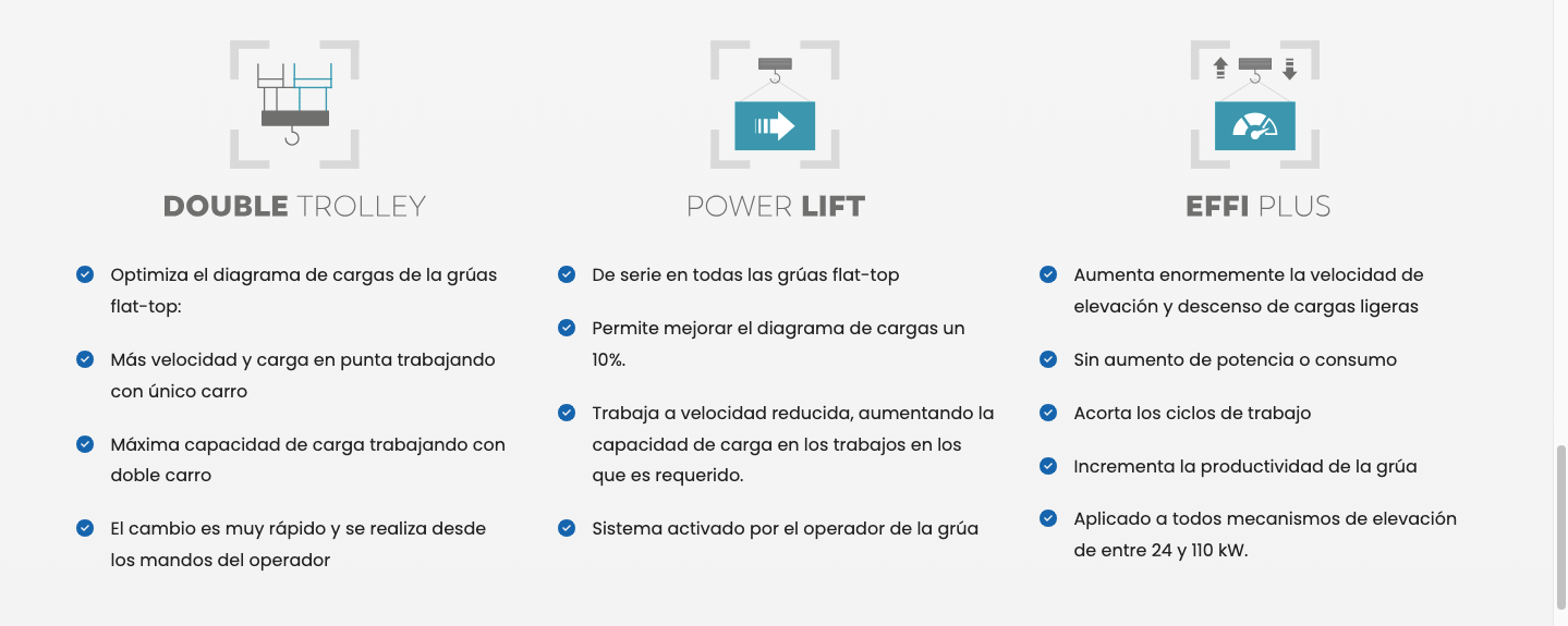 Nuestras grúas trabajan con una mejor transmisión de esfuerzos en la pluma que alarga la vida útil. El sistema Flat-Top reduce la fatiga de las plumas trabajando siempre con la viga superior en tensión y las inferiores en compresión, evitando así fuerzas alternativas.